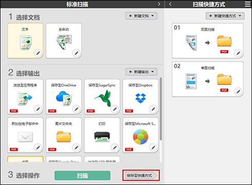 如需指定文件选择和输出的组合,可以编辑“扫描快捷方式”面板以设置所需扫描快捷方式。