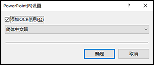 菜单 设置 其他设置 PowerPoint(R)设置 PowerPoint(R)设置 详细设置PowerPoint(R)文件。 如果有 1000 个或更多的扫描图像,则无法创建 PowerPoint(R) 文件。 在“选择输出”面板编辑对话框中选择[PPTX]作为[文件类型]。 对于扫描快捷方式 -> 设置输出 对于标准扫描 -> 设置输出 单击[详细设置]按钮。 将显示[PowerPoint(R)设置]对话框。 [添加OCR信息] 选中此项可在扫描图像中识别文本部分,以便将图像和文本数据一起保存。 从下拉式菜单中选择要识别的语言。 顶部