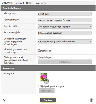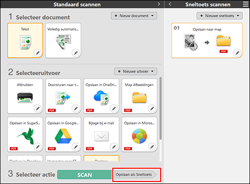 Om combinaties van documentselectie en uitvoer te specificeren, kun het Sneltoets scannen-paneel bewerken om de gewenste sneltoets scannen in te stellen.