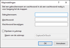 Klik op de knop [Detailinstellingen] om het dialoogvenster [Mapinstellingen] weer te geven. U kunt de referenties (gebruikersnaam en wachtwoord) configureren voor toegang tot de opgegeven map.