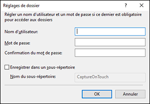 Cliquez sur le bouton [Paramètres de détail] pour afficher la boîte de dialogue [Réglages de dossier]. Vous pouvez configurer les informations de connexion (nom d’utilisateur et mot de passe) nécessaires pour accéder au dossier spécifié.