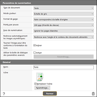 Les paramètres de Rac. Numérisation comprennent les éléments de base qui sont configurés dans [Paramètres de numérisation] et les éléments de paramétrage qui sont configurés dans la boîte de dialogue des paramètres avancés. Les paramètres de la boîte de dialogue des paramètres avancés s’appliquent aux paramètres autres que les éléments de base.